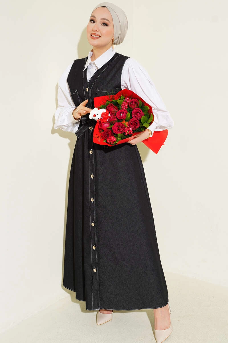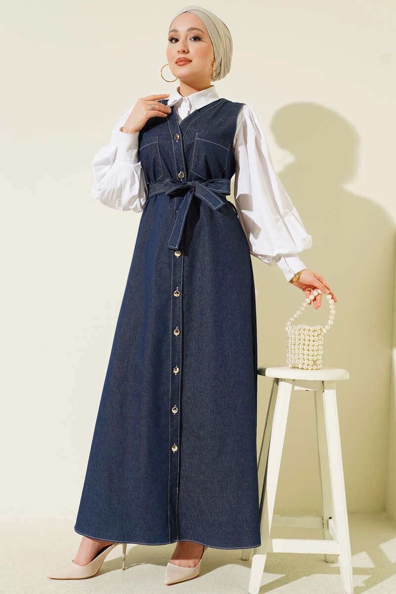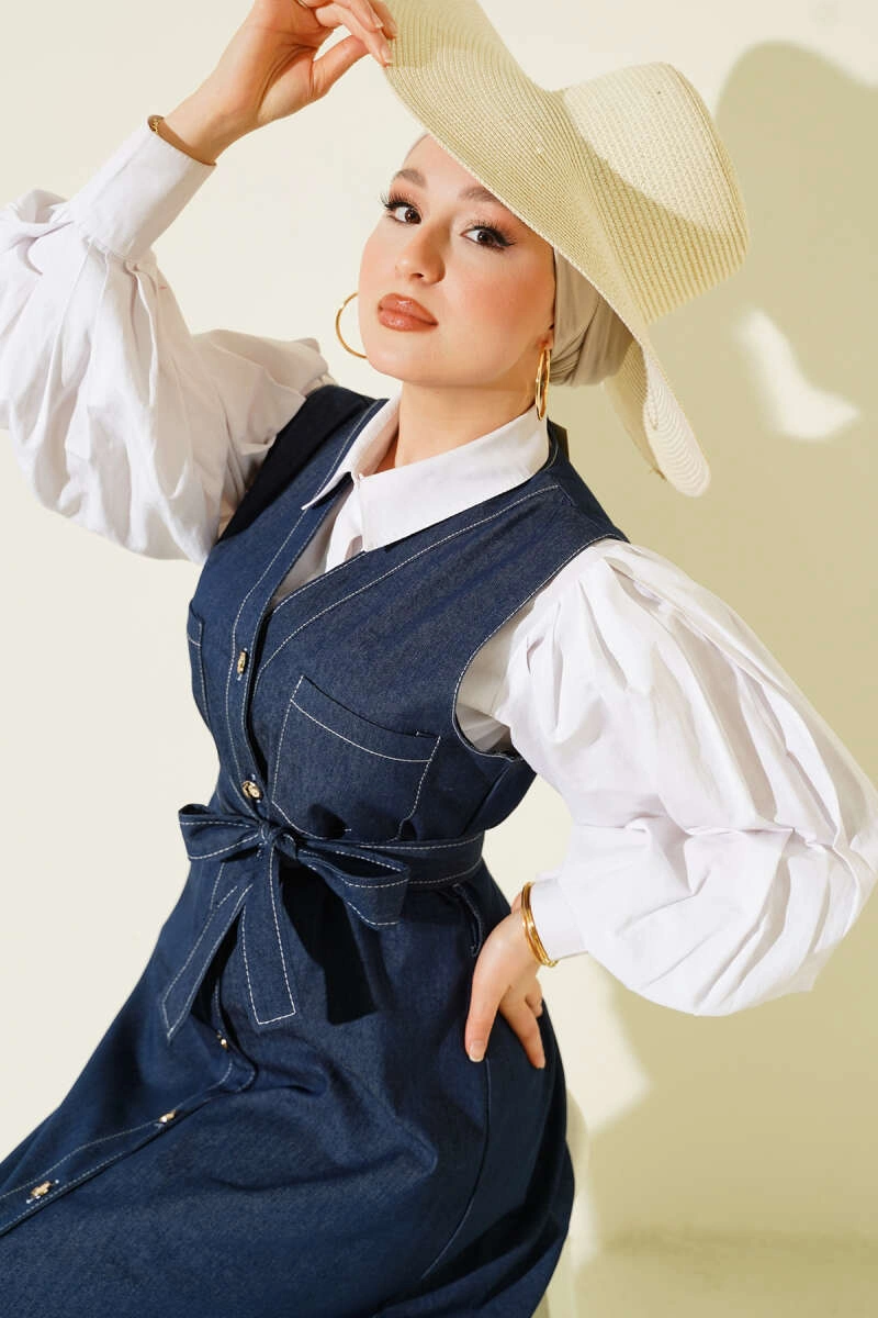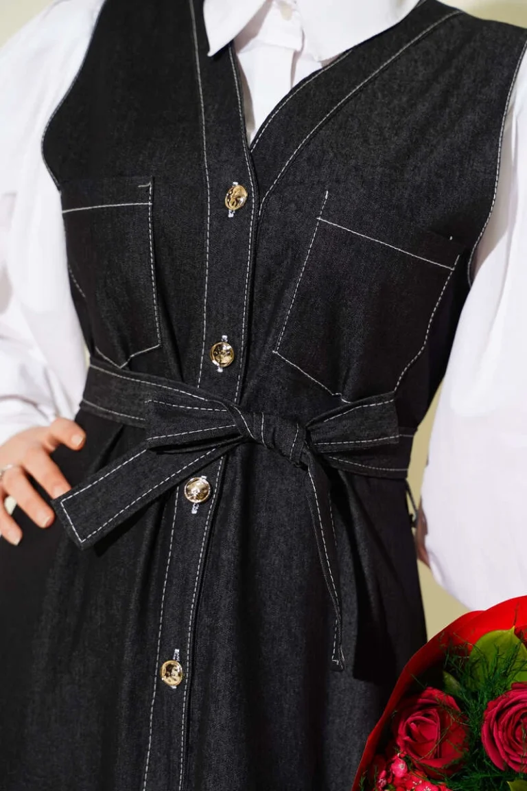 فستان جينز بلا أكمام بأزرار أمامية وجيوب مزدوجة | RM0569-4002