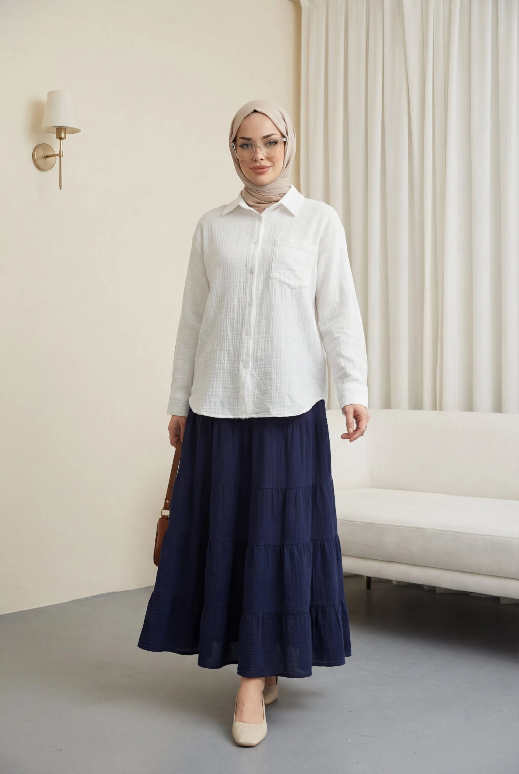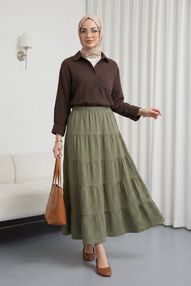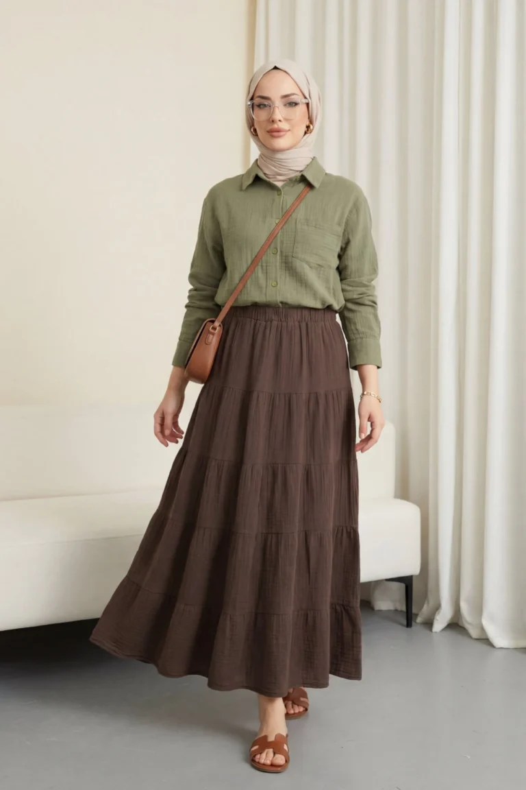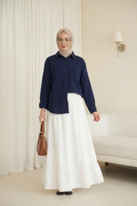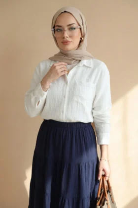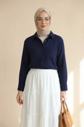 يحتضن الجسم بقصته المريحة دون أن يضغط، مما يمنح إحساساً بالراحة. يمكن تسميته بـ “قميص موسلين بجيب واحد”، “قميص موسلين بأزرار”، “نماذج قمصان نسائية مريحة”.
