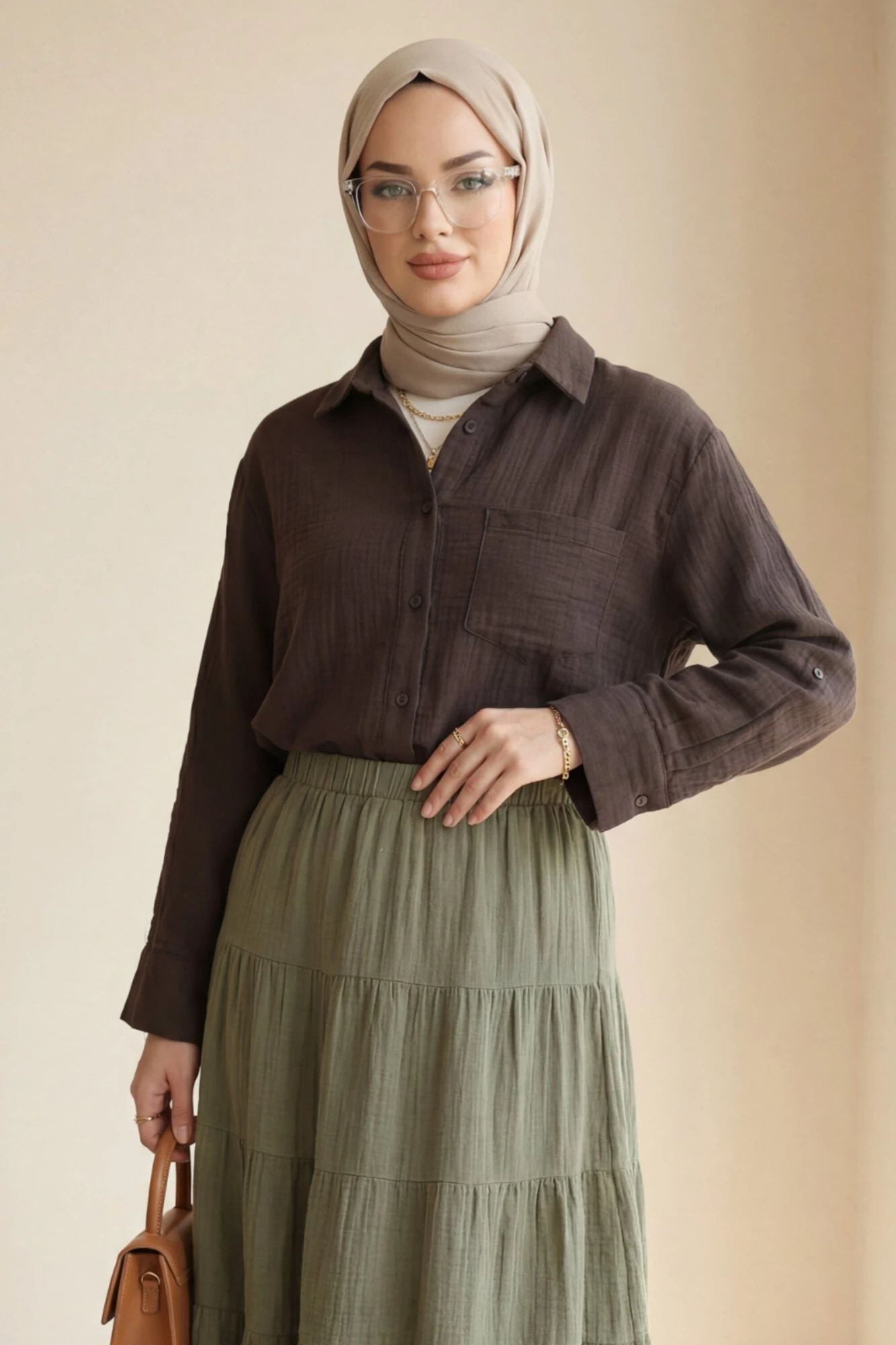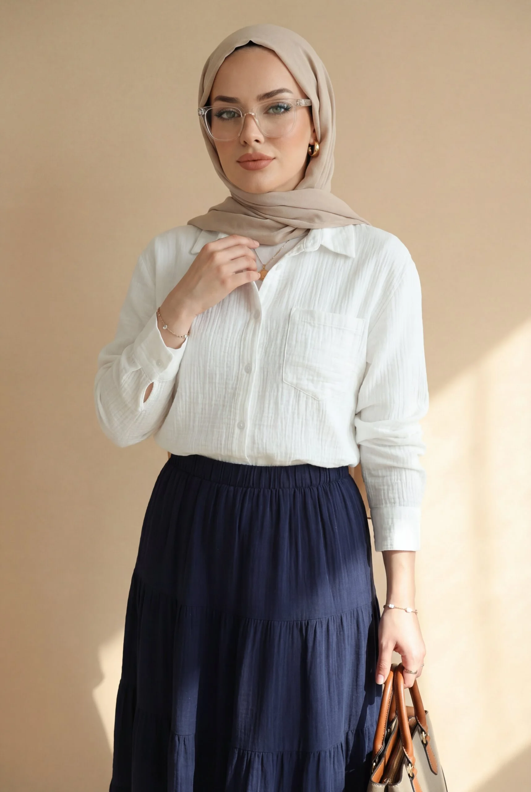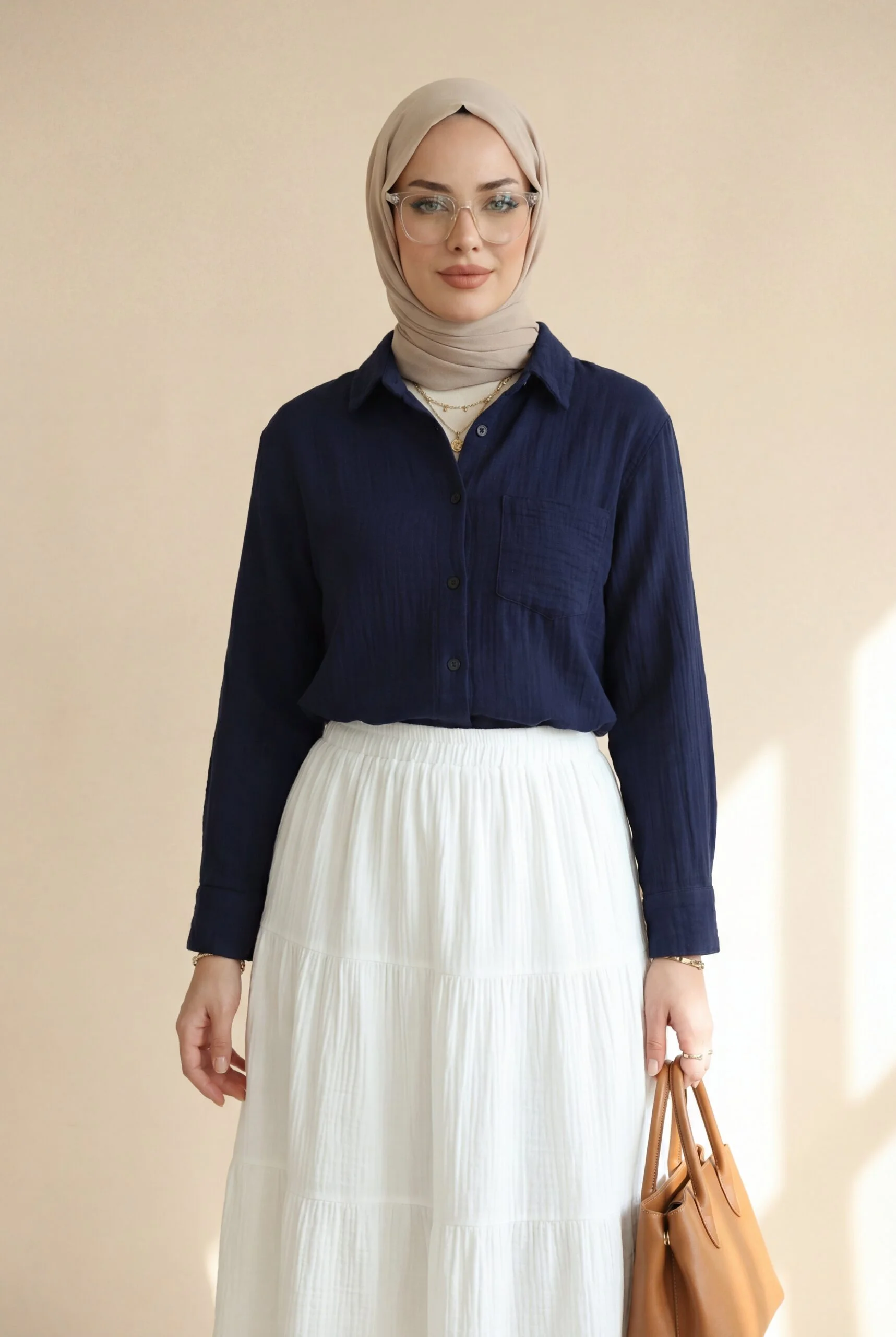 يحتضن الجسم بقصته المريحة دون أن يضغط، مما يمنح إحساساً بالراحة. يمكن تسميته بـ “قميص موسلين بجيب واحد”، “قميص موسلين بأزرار”، “نماذج قمصان نسائية مريحة”.
